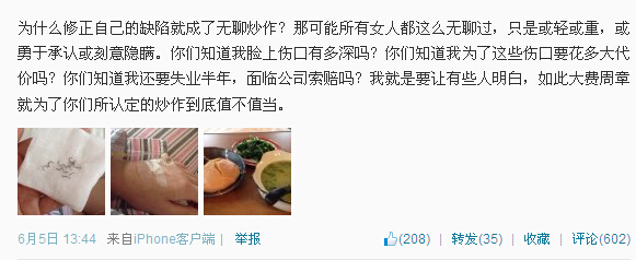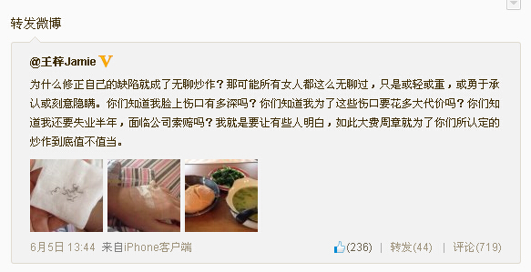 6月5日 13:44 为什么修正自己的缺陷就成了无聊炒作?那可能所有女人都这么无聊过,只是或轻或重,或勇于承认或刻意隐瞒。你们知道我脸上伤口有多深吗?你们知道我为了这些伤口要花多大代价吗?你们知道我还要失业半年,面临公司索赔吗?我就是要让有些人明白,如此大费周章就为了你们所认定的炒作到底值不值当。