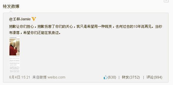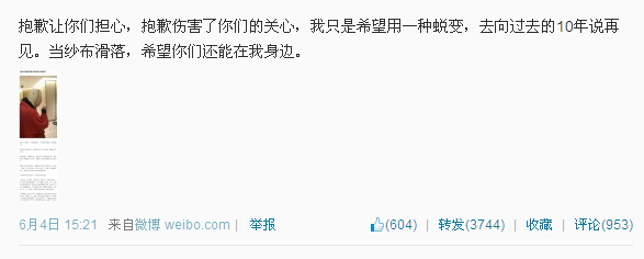 6月4日 15:21 抱歉让你们担心,抱歉伤害了你们的关心,我只是希望用一种蜕变,去向过去的10年说再见。当纱布滑落,希望你们还能在我身边。